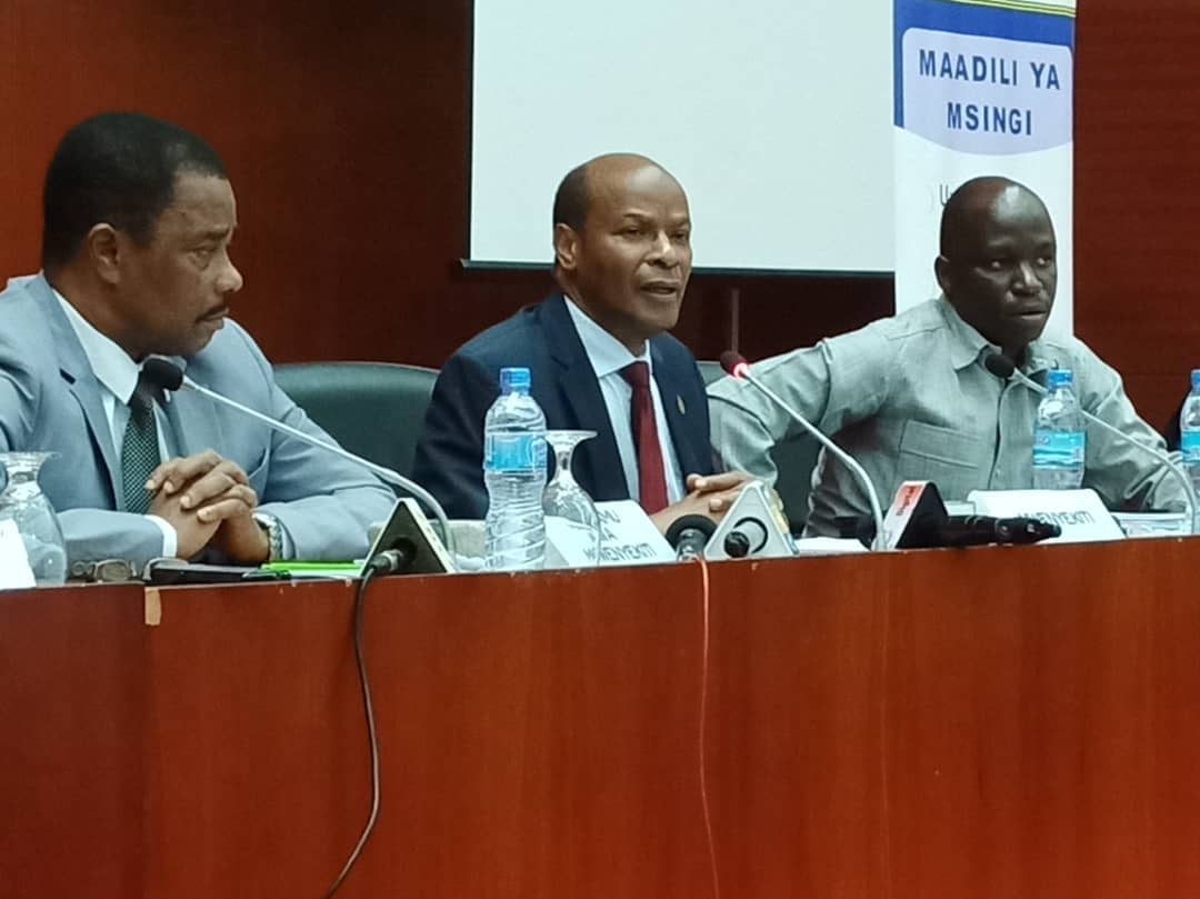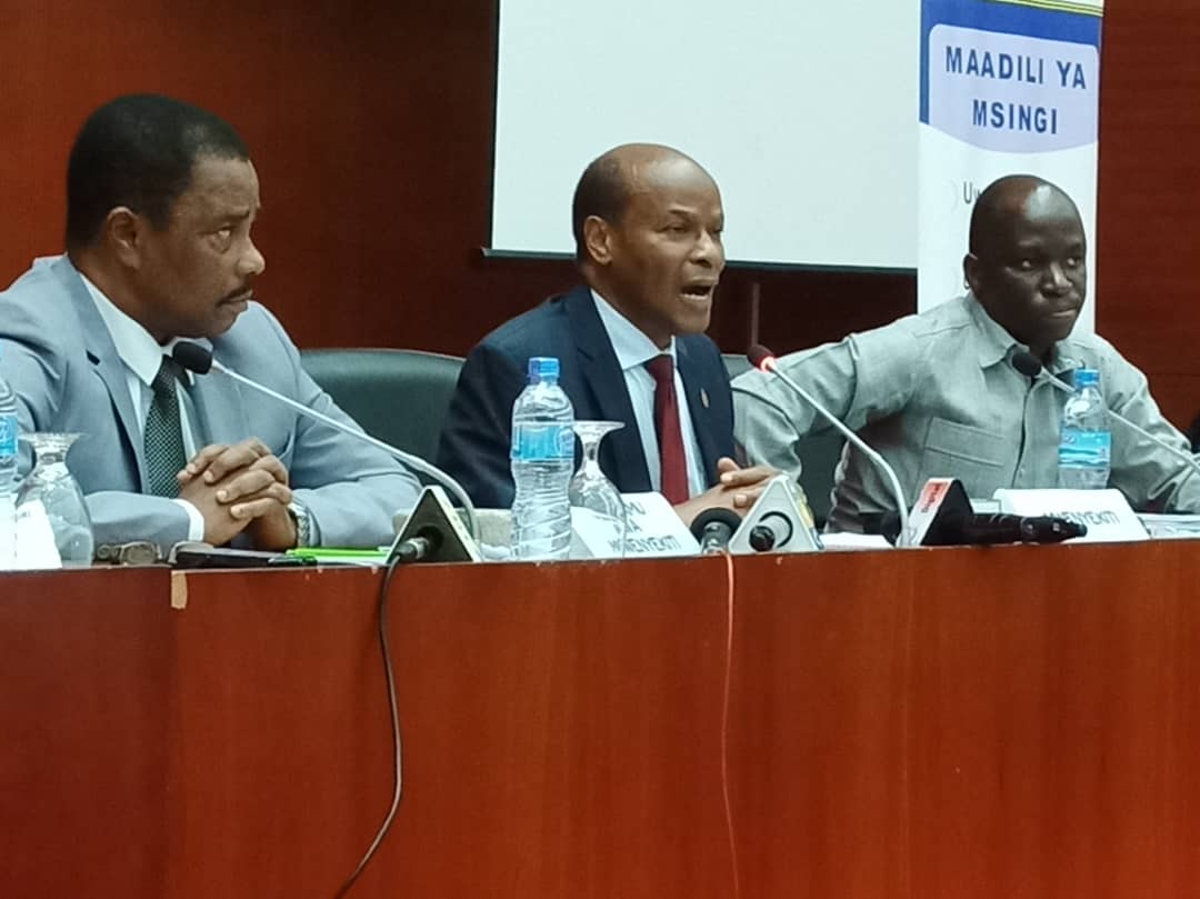 Mwenyekiti wa Tume ya Taifa ya Uchaguzi (NEC) Jaji Mstaafu Semistocles Kaijage akizungumza na viongozi wa vyama vya siasa nchini katika kuelekea Uchaguzi Mkuu na masuala mbalimbali ikiwemo uboreshaji wa daftari la kudumu la Mipiga kura kulia ni Mkurugenzi wa Uchazi wa Tume ya Taifa ya Uchaguzi (NEC) Dkt.Wilson Mahera na kushoto ni Makamu Mwenyekiti wa Tume ya Uchaguzi Jaji Mbarouk S Mbarouk, Mkutano huo umefanyika kwenye ukumbi wa Julius Nyerere jijini Dar es salaam leo.