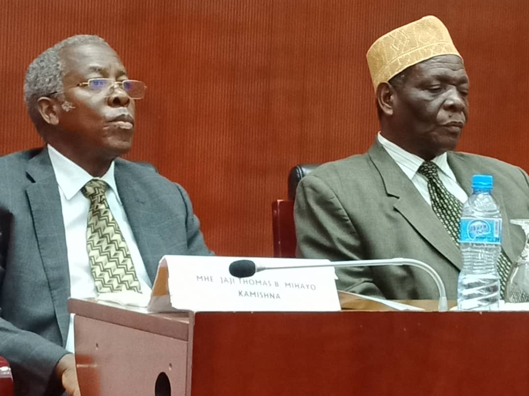 Makamishna wa Tume ya Uchaguzi NEC kulia MH. Ramadhan Mapuri na kulia Jaji Thomas Mihayo wakiwa katika mkutano huo wa wadau wa Vyama vya Siasa.