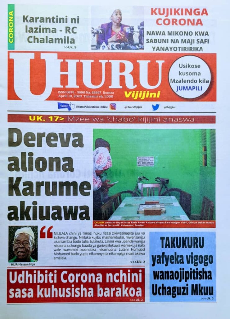 MagazetiPITIA VICHWA VYA HABARI KATIKA MAGAZETI YA LEO APRIL 10,2020 Last updated: 2020/04/10 at 4:40 AM Alex Sonna 6 years ago Share SHARE Alex Sonna April 10, 2020 April 10, 2020 Share this Article Facebook Twitter Email Print Previous Article MIRADI YA REA YAIPAISHA TANZANIA AFRIKA Next Article NABII JOSHUA: TUTAHAKIKISHA CORONA INAONDOKA TANZANIA KUPITIA MAOMBI NA ELIMU KWA WATANZANIA WOTE
