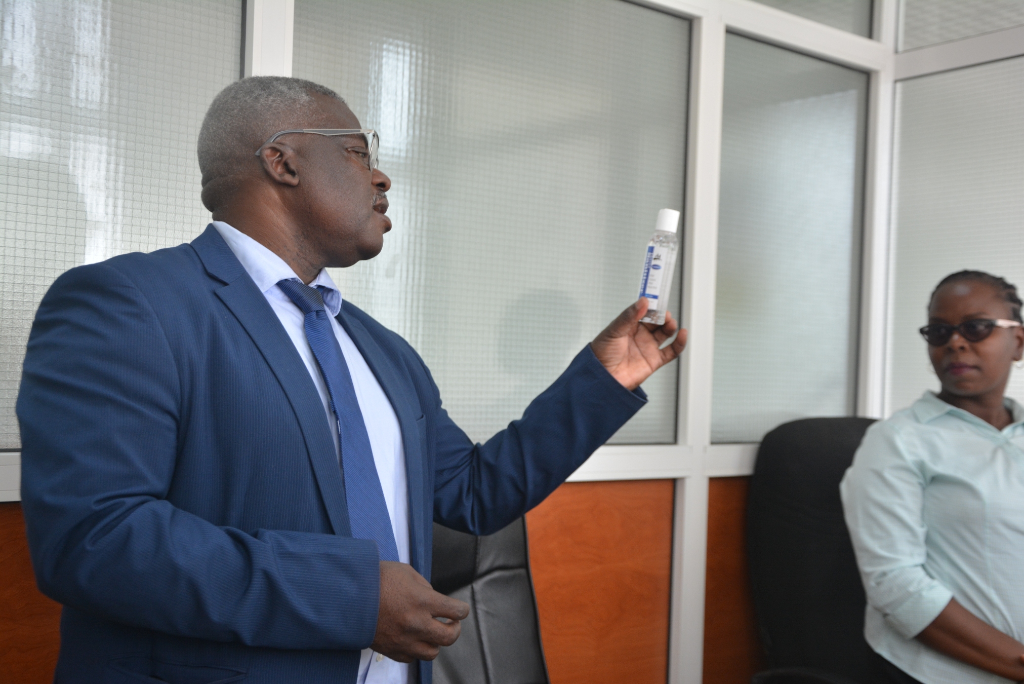 Mtumishi wa Wizara ya Ujenzi, Uchukuzi na Mawasiliano (Sekta ya Ujenzi), Placidia Fabian, akimuonesha Katibu Mkuu wa Sekta hiyo, Mbunifu Majengo, Elius Mwakalinga, kitakasa mikono alichogawiwa na Sekta hiyo ikiwa ni hatua mojawapo ya kutekeleza maelekezo ya Wizara ya Afya namna ya kujikinga na maambukizi ya Homa ya Mapafu (Covid – 19), jijini Dodoma. Katibu Mkuu huyo amefanya ziara ya kushtukiza kwa watumishi wake leo kubaini matumizi sahihi ya vitakasa mikono.