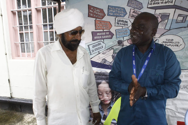 MENEJA WA Mfuko wa Taifa wa Bima ya Afya Mkoani Tanga (NHIF) Ally Mwakababu kulia akiteta jambo na Mwenyekiti wa Mtaa wa Senkrani Mohon Singh aliyefika kwenye ofisi zao kupata huduma za bima ambapo kwa sasa wanatoa huduma zao nje ya ofisi ikiwa ni sehemu ya kupunguza mkusanyiko na kuweza kukabiliana na ugonjwa wa Virusi vya Corona ambao kwa sasa unaitikisa dunia.