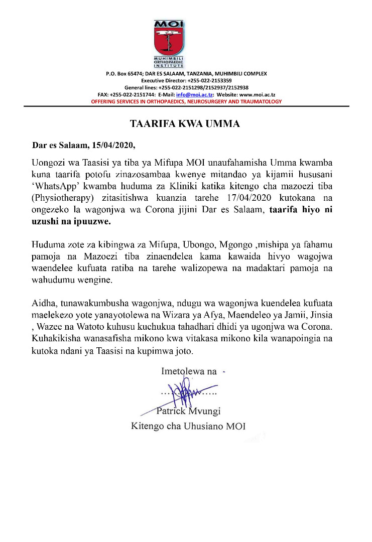MchanganyikoMOI Yakanusha Kusitisha Huduma za Kliniki Last updated: 2020/04/15 at 10:31 AM joseph 6 years ago Share SHARE joseph April 15, 2020 April 15, 2020 Share this Article Facebook Twitter Email Print Previous Article MATUKIO YA MHESHIMIWA WAZIRI MKUU BUNGENI Next Article RAIS DKT MAGUFULI ATUMA SALAMU ZA RAMBI RAMBI KUFUATIA WATU 18 KUPOTEZA MAISHA KATIKA AJALI,WILAYA YA MKURANGA