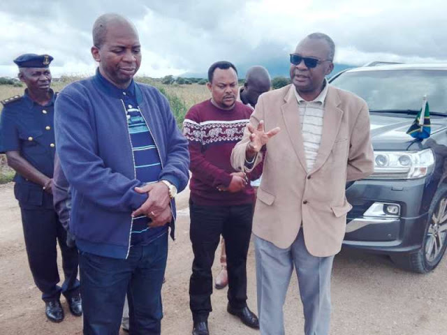 Mkuu wa Wilaya ya Hanang, Bw. Joseph Mkirikiti akisikiliza maelekezo ya Naibu Waziri wa Ujenzi, Mhe. Elias Kwandikwa alipokagua matengenezo ya barabara za Genandu-Babati km 105 na Mogitu-Haydom km 68.