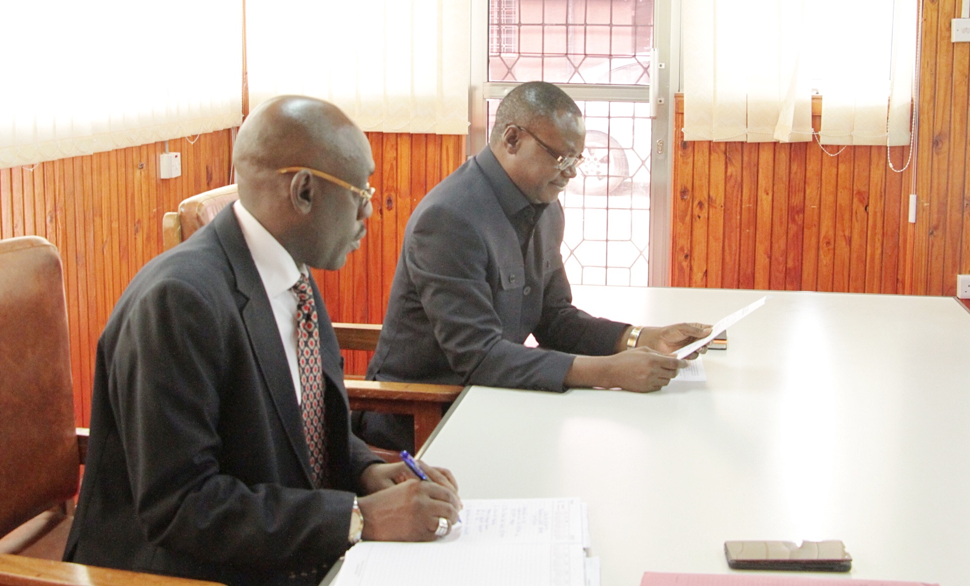 Baadhi ya wajumbe wa kikao cha kujadili mpango kabambe wa Ujenzi wa Ofisi za Wizara Awamu ya Pili katika eneo la Mji wa Serikali Mtumba Dodoma, wakifuatilia kikao hicho leo tarehe 20, Aprili, 2020 katika Ukumbi wa Mikutano wa ofisi ya Waziri Mkuu, Dodoma, kulia ni, Naibu Katibu Mkuu wa Wizara ya Ujenzi, Uchukuzi na Mawasiliano (Sekta ya Mawasiliano) Dkt. Jim Yonazi na (kushoto) ni Naibu Katibu Mkuu, Ofisi ya Rais Utumishi na Utawala Bora, Dkt. Francis Michael na Katibu Mkuu Wizara ya Habari, Utamaduni, Sanaa na Michezo , Dkt. Hassan Abbas (katikati).