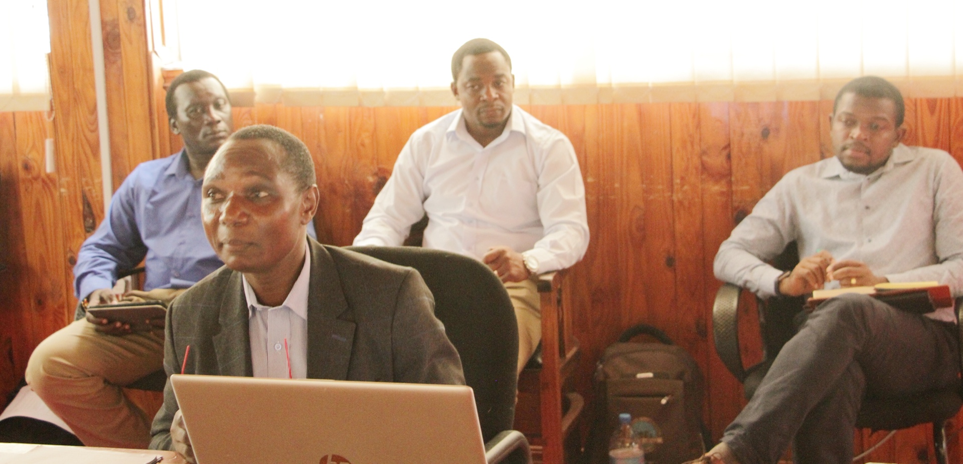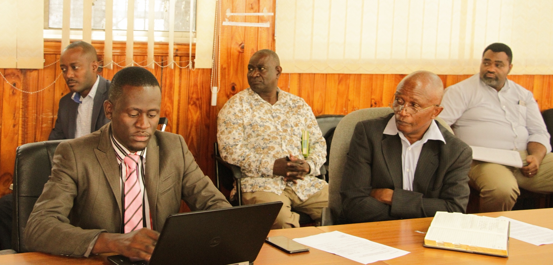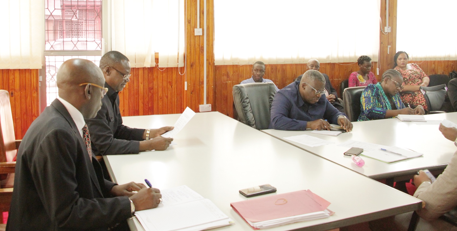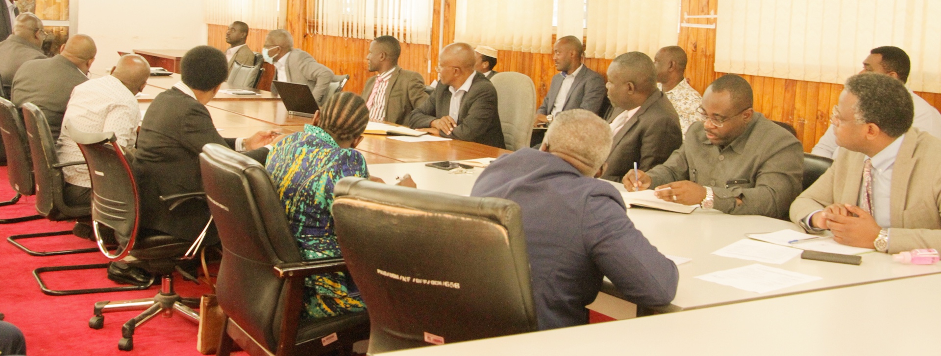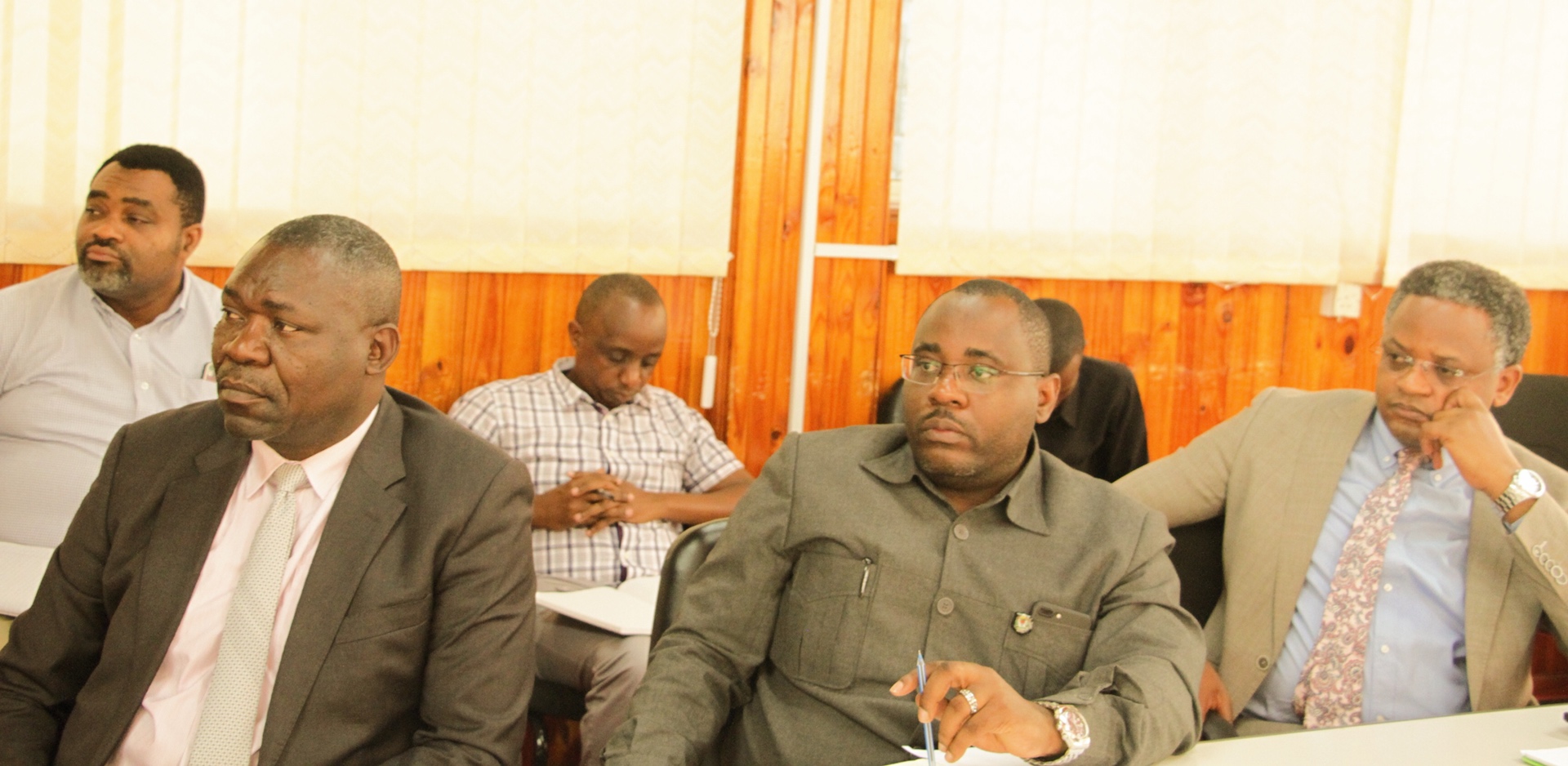 Baadhi ya wajumbe wa kikao cha kujadili mpango kabambe wa Ujenzi wa Ofisi za Wizara Awamu ya Pili katika eneo la Mji wa Serikali Mtumba Dodoma, wakifuatilia kikao hicho leo tarehe 20, Aprili, 2020 katika Ukumbi wa Mikutano wa ofisi ya Waziri Mkuu, Dodoma.