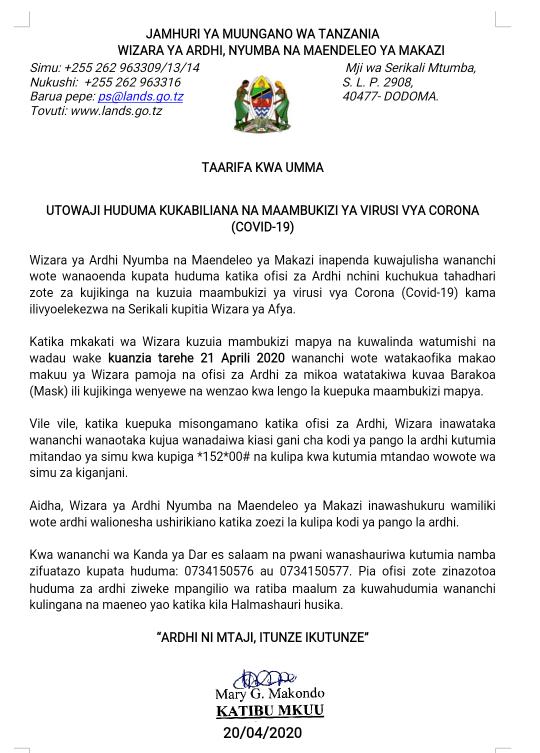 MchanganyikoWIZARA YA ARDHI IMETOA UFAFANUZI JUU YA UTOAJI HUDUMA KUKABILIANA NA MAAMBUKIZI YA VIRUSI VYA CORONA (COVID-19) Last updated: 2020/04/20 at 4:27 PM joseph 6 years ago Share SHARE joseph April 20, 2020 April 20, 2020 Share this Article Facebook Twitter Email Print Previous Article WAGONJWA WAPYA WA CORONA 84 WAONGEZEKA NA KUFARIKI WATATU ( 3 ) NCHINI TANZANIA Next Article MTATURU AMSHUKURU RAIS MAGUFULI KWA KUTOA SH BILIONI 2 ZA UJENZI WA VETA IKUNGI