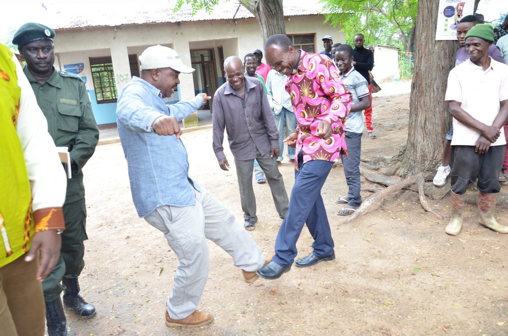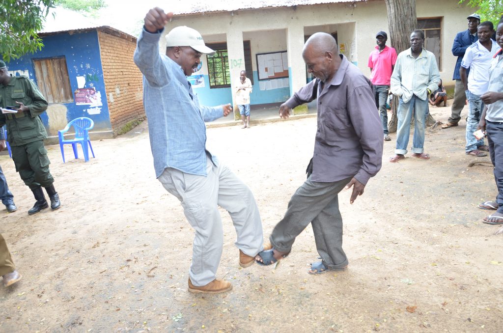 Mbunge wa Kilolo, Mhe. Venance Mwamoto akisalimiana na Abel Chang’a kwa kugonga miguu ikiwa ni salamu inayoshauriwa kutumiwa kwa sasa kutokana na mlipuko wa ugonjwa wa Corona ili kuepuka kuambukizana virusi vya ugonjwa huo mara baada ya Naibu Waziri wa Maliasili na Utalii, Mhe. Constantine Kanyasu kumaliza kuzungumza na wananchi wa Kijiji cha Irindi kilichopo katika wilya ya Kilolo mkoani Iringa