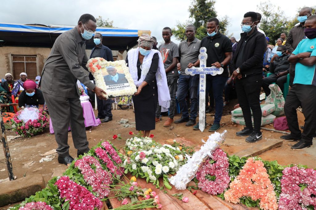 Waziri wa Nishati,Medard Kalemani akiweka shada juu ya kaburi la Baba Mzazi wa Waziri wa Mambo ya Ndani ya Nchi, George Simbachawene, Marehemu Boniface Simbachawene , wakati wa ibada ya mazishi yaliyofanyika katika Kijiji cha Pwaga kilichopo Jimbo la Kibakwe , wilayani Mpwapwa mkoani Dodoma.