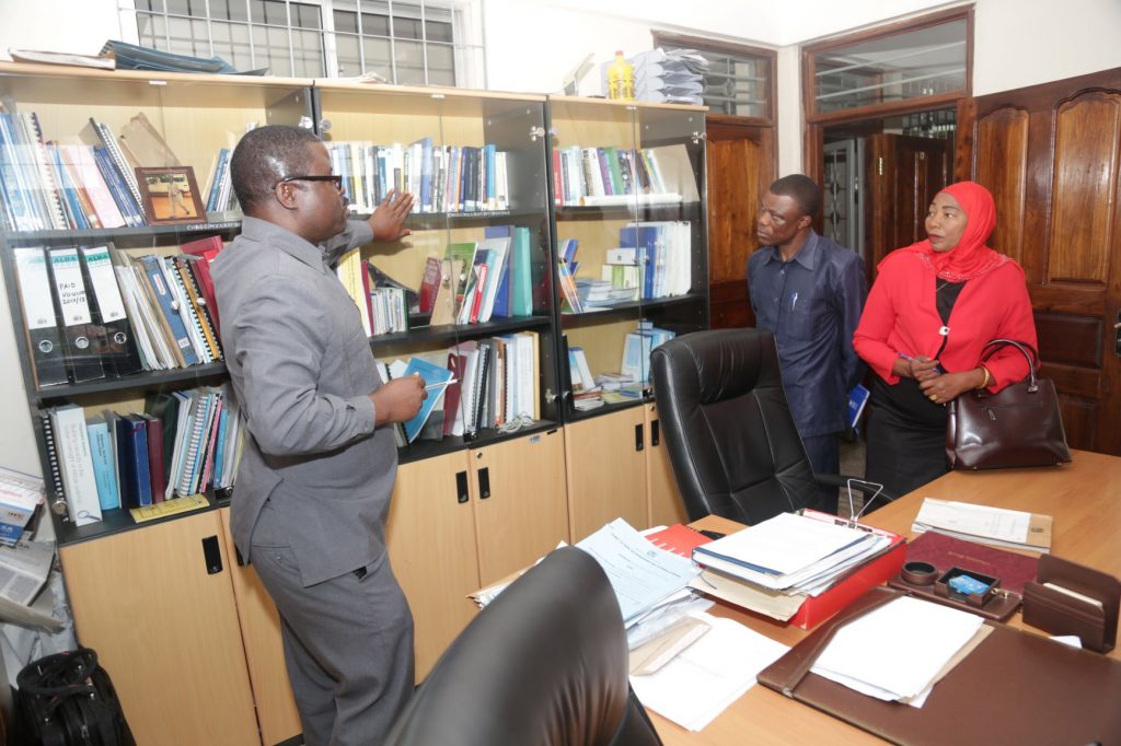 Afisa Mfawidhi wa Ofisi za THBUB Kanda ya Ziwa, Albert Kakengi (kushoto) akimuonesha Kaimu Katibu Mtendaji wa THBUB, Hajjat Fatuma Muya (Kulia) baadhi ya machapisho kuhusu haki za watoto yaliyopo katika maktaba ndogo ofisini hapo. Wa pili kulia ni Kaimu