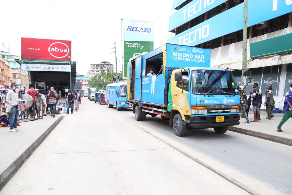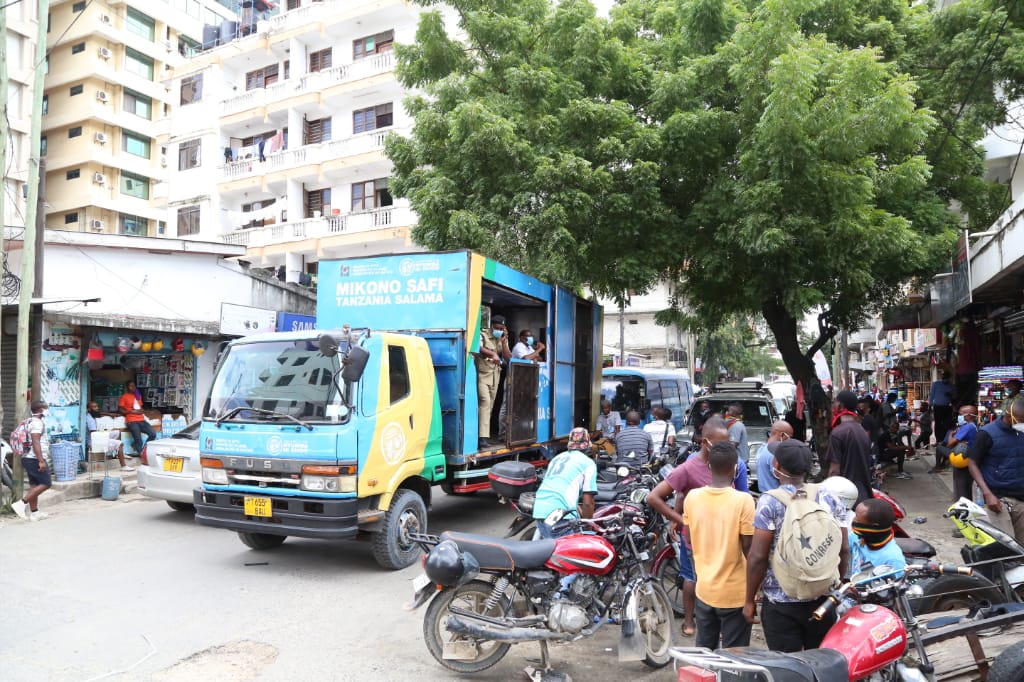 Timu ya uhamasishaji kutoka Wizara ya Afya kwa kushirikiana na Wadau kutoka Shirika lisilo Lakiserikali la Project CLEAR na kampuni ya Mjomba Gallery ikiendelea na utoaji elimu kwa wafanyabiashara wa Kariakoo Jiji la Dar es Salaam kuhusu kuchukua tahadhari za kujikinga dhidi ya maambukizi ya homa kali ya mapafu inayosababishwa na virusi vya Corona.