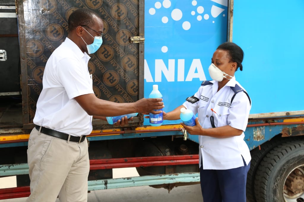 Mkuu wa Kitengo cha maji na usafi wa mazingira, Wizara ya Afya, Ndg. Anyitike Mwakitalima akikabidhi vitakasa mikono kwa askari wa jeshi la polisi kikosi cha usalama barabarani ili viwasaidie kujilinda dhidi ya maambukizi ya virusi vya Corona wakati wa kutoa huduma kwa wananchi, katika eneo la Kariakoo Jijini Dar es Salaam.