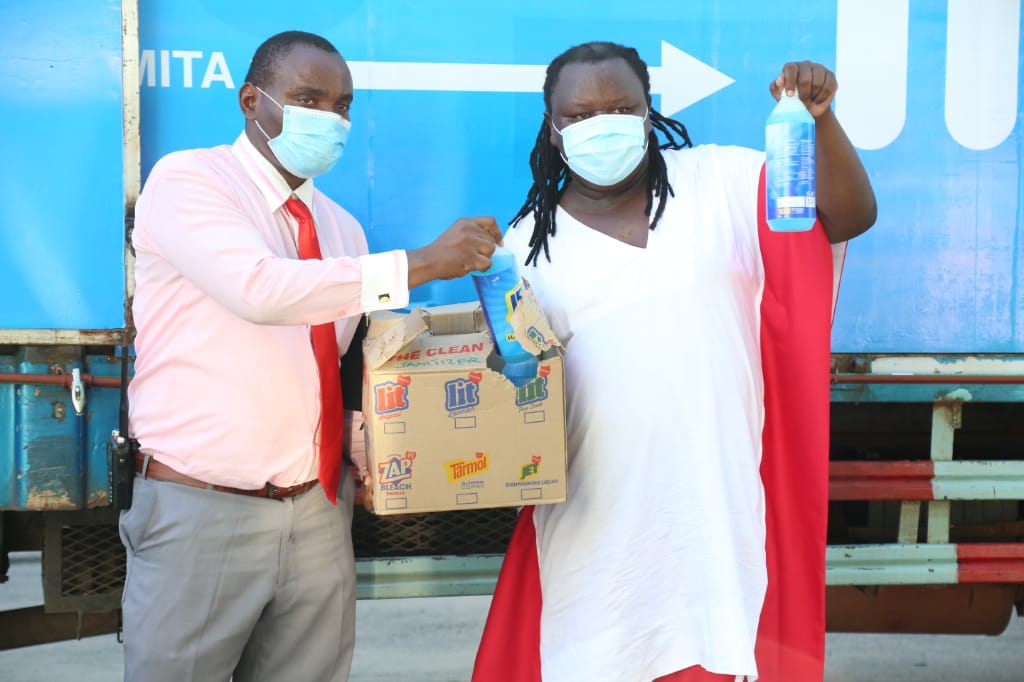 Balozi wa kampeni ya Mikoni safi, Tanzania salama, Msanii Mrisho Mpoto (Mjomba), akikabidhi boksi la vitakasa mikono (sanitizer) Mrakibu msaidizi wa polisi (ASP) Angelica, makao makao makuu ndogo ya jeshi la polisi, Posta Jijini Dar es Salaam.