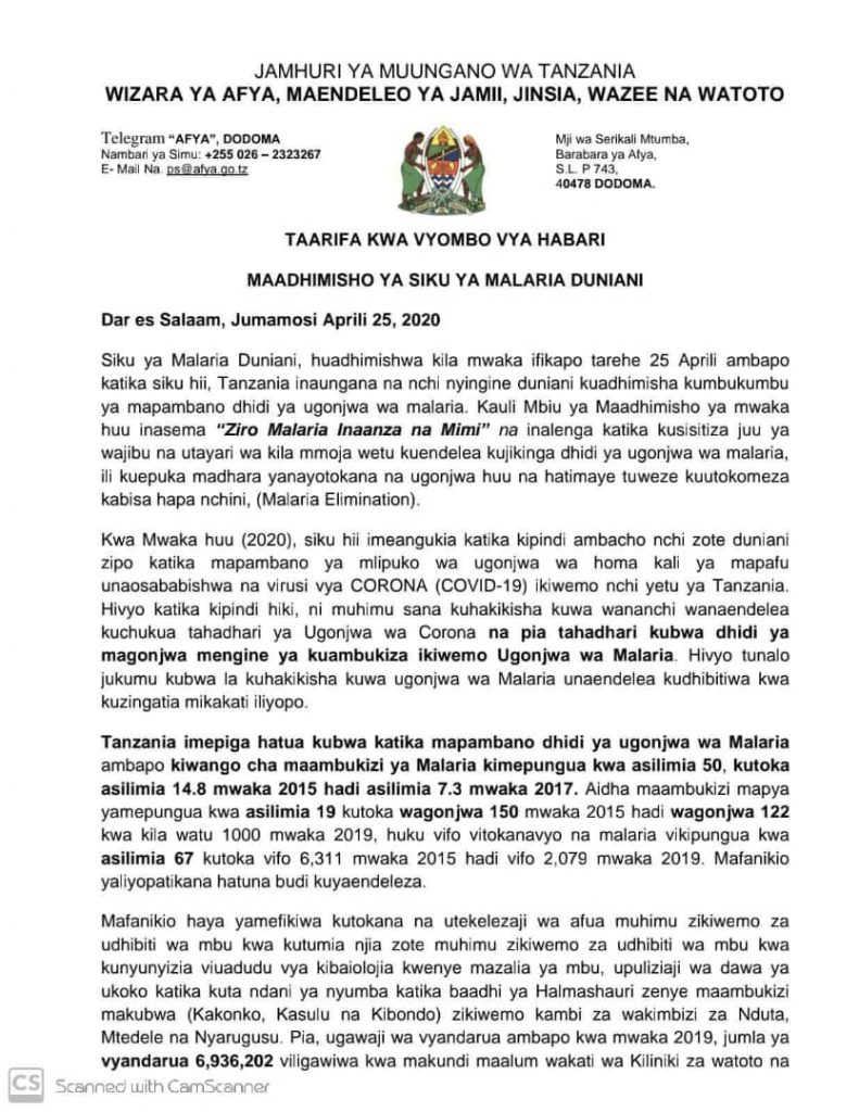 MchanganyikoTAARIFA KWA UMMA KUHUSU MAADHIMISHO YA SIKU YA MALARIA DUNIANI Last updated: 2020/04/25 at 11:17 AM Alex Sonna 6 years ago Share SHARE Alex Sonna April 25, 2020 April 25, 2020 Share this Article Facebook Twitter Email Print Previous Article SHINYANGAYATAKIWA KUKAMILISHA MIRADI MIKUBWA KWA WAKATI Next Article RC SINGIDA ATOA FUTARI YA MWEZI MTUKUFU WA RAMADHAN KWA WAISLAMU