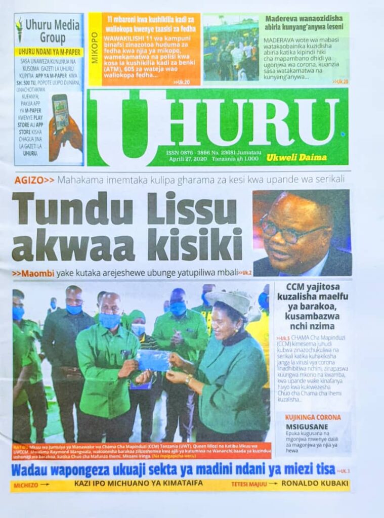 MagazetiPITIA VICHWA VYA HABARI KATIKA MAGAZETI YA LEO APRIL 27,2020 Last updated: 2020/04/27 at 6:55 AM Alex Sonna 6 years ago Share SHARE Alex Sonna April 27, 2020 April 27, 2020 Share this Article Facebook Twitter Email Print Previous Article CHAMA CHA WALIMU IRAMBA MKOANI SINGIDA CHAFANYA MAAMUZI MAGUMU Next Article SERIKALI YAMGALAGAZA TUNDU LISSU MAHAKAMANI