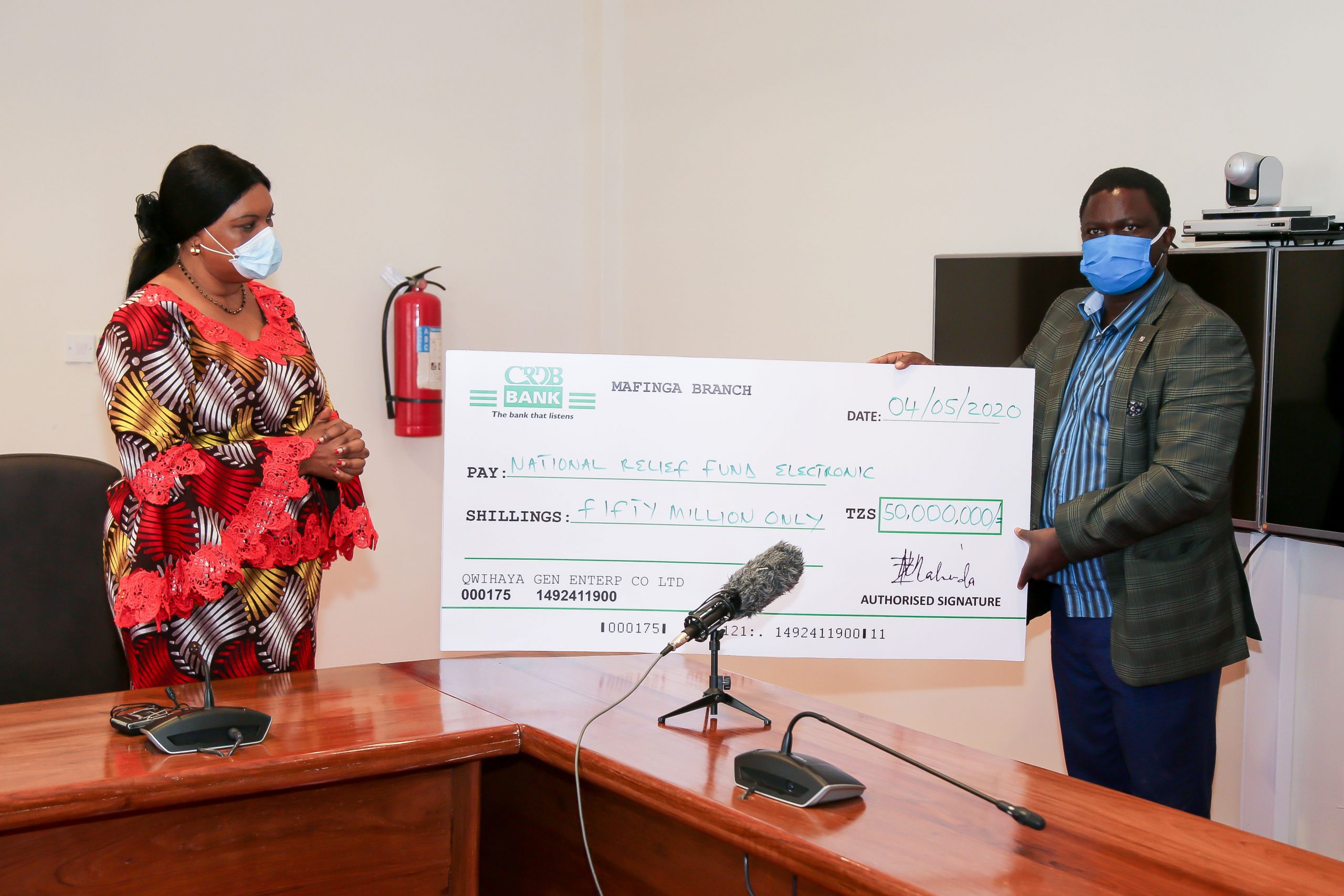 Mkurugenzi wa kampuni ya kuzalisha nguzo ya Qwihaya General Enterpises Co. Limited, Leonard Mahenda, ikiwa ni mchango kwa ajili ya kuunga mkono juhudi za Serikali za