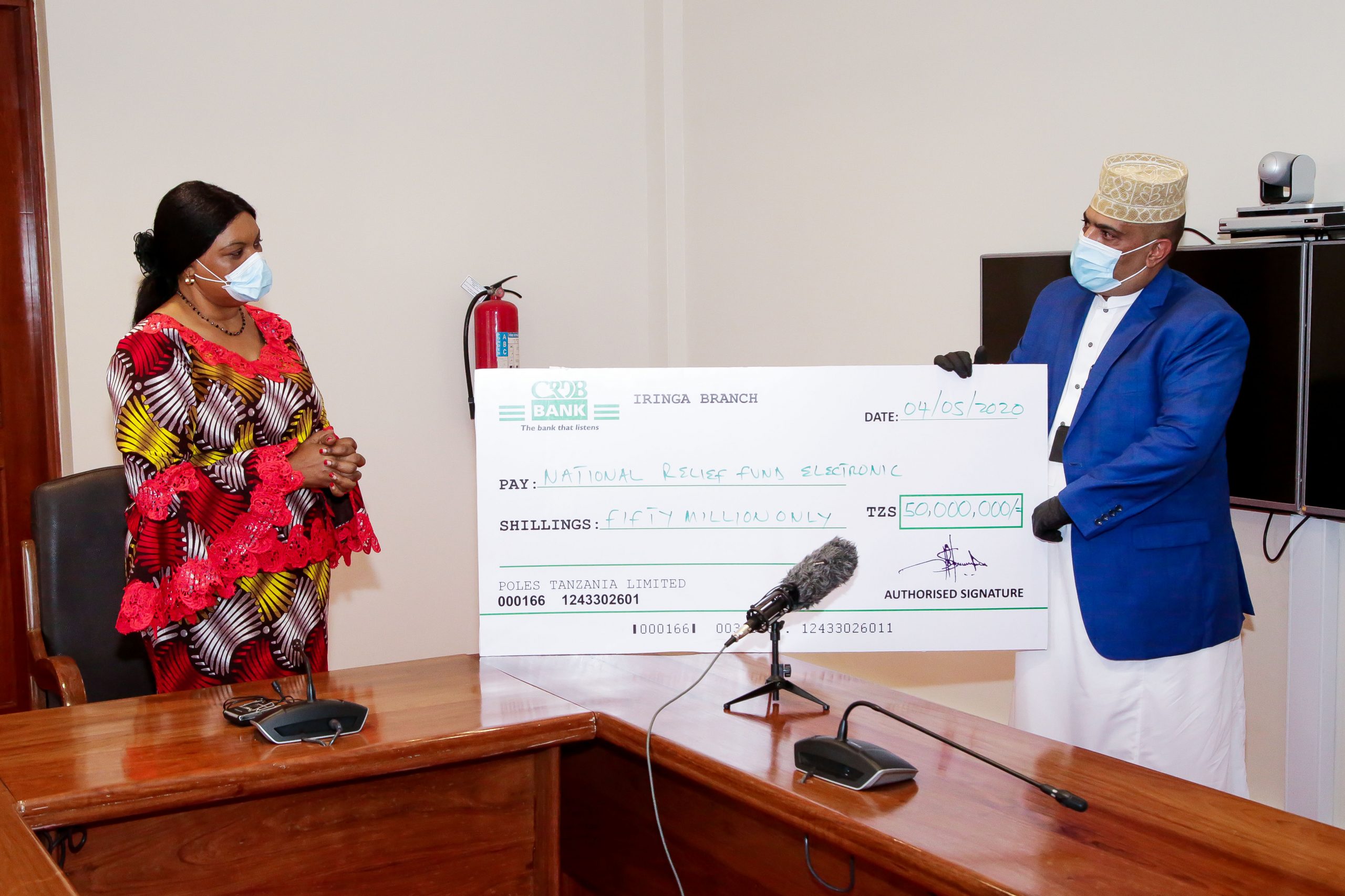 kwa Mkurugenzi Mkuu wa kampuni ya kuzalisha nguzo ya POLES (T) Limited, Salim Bisher Huwel, ikiwa ni mchango kwa ajili ya kuunga mkono juhudi za Serikali za mapambano dhidi ya ugonjwa wa homa kali ya mapafu- COVID – 19. Makabidhiano hayo yalifanyika kwenye Ofisi ya Waziri Mkuu, Mlimwa jijini Dodoma, Mei 4, 2020. (Picha na Ofisi ya Waziri Mkuu)