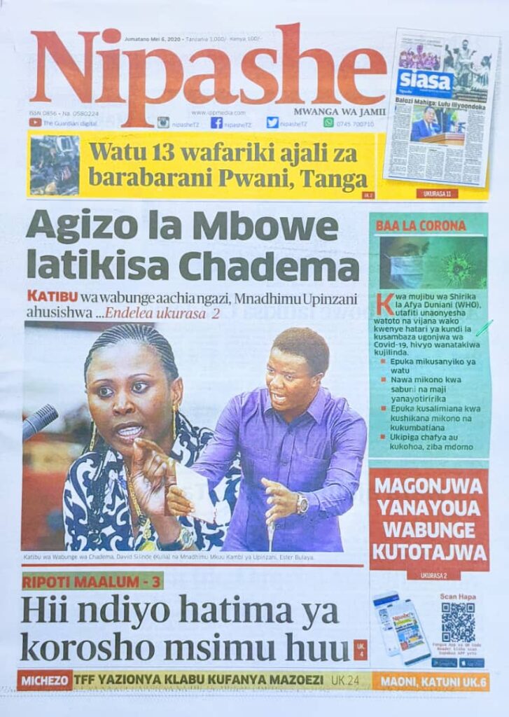 MagazetiPITIA VICHWA VYA HABARI KATIKA MAGAZETI YA LEO MAY 6,2020 Last updated: 2020/05/06 at 5:24 AM Alex Sonna 6 years ago Share SHARE Alex Sonna May 6, 2020 May 6, 2020 Share this Article Facebook Twitter Email Print Previous Article VYUO VYA KILIMO NCHINI VYATAKIWA KUJIIMARISHA KIMAPATO Next Article RAIS FEMATA ATAKA WANASIASA WAACHE KUINGILIA MAJUKUMU YA RAIS MAGUFULI