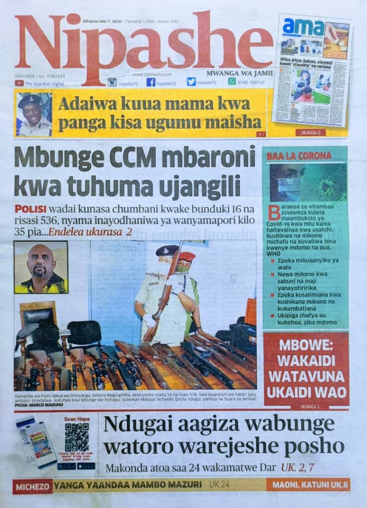 MagazetiPITIA VICHWA VYA HABARI KATIKA MAGAZETI YA LEO MAY 7,2020 Last updated: 2020/05/07 at 3:13 AM Alex Sonna 6 years ago Share SHARE Alex Sonna May 7, 2020 May 7, 2020 Share this Article Facebook Twitter Email Print Previous Article TMA YAWATAKA WANANCHI WANAOISHI KANDOKANDO YA ZIWA VICTORIA KUCHUKUA TAHADHARI JUU YA MVUA ZINAZONYESHA Next Article TANGA CEMENT (PLC) WATOA MSAADA WA VIFAA VYA KUJIKINGA NA COVID -19 TANGA