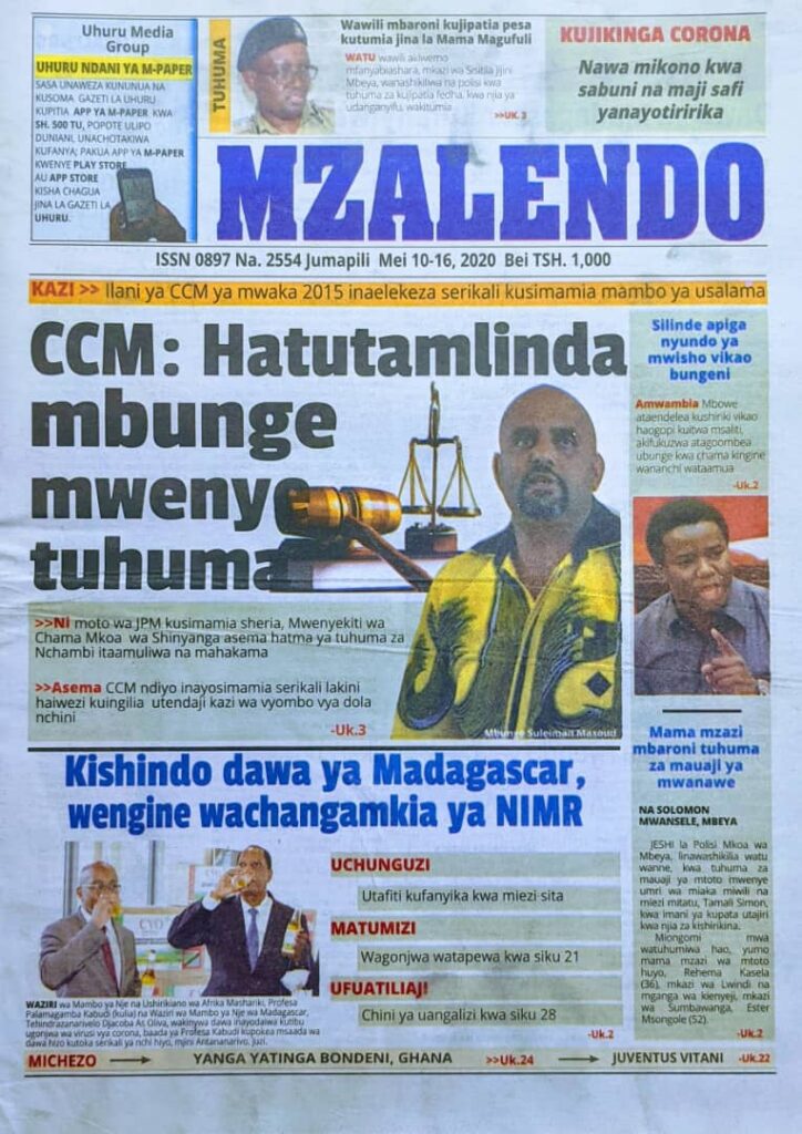 MagazetiPITIA VICHWA VYA HABARI KATIKA MAGAZETI YA LEO MAY 10,2020 Last updated: 2020/05/10 at 3:38 AM Alex Sonna 6 years ago Share SHARE Alex Sonna May 10, 2020 May 10, 2020 Share this Article Facebook Twitter Email Print Previous Article TLP kumuumga mkono Rais JPM kwenye Uchaguzi Mkuu Next Article KWANDIKA AKABIDHI GARI LA WAGONJWA KITUO CHA AFYA MBIKA USHETU