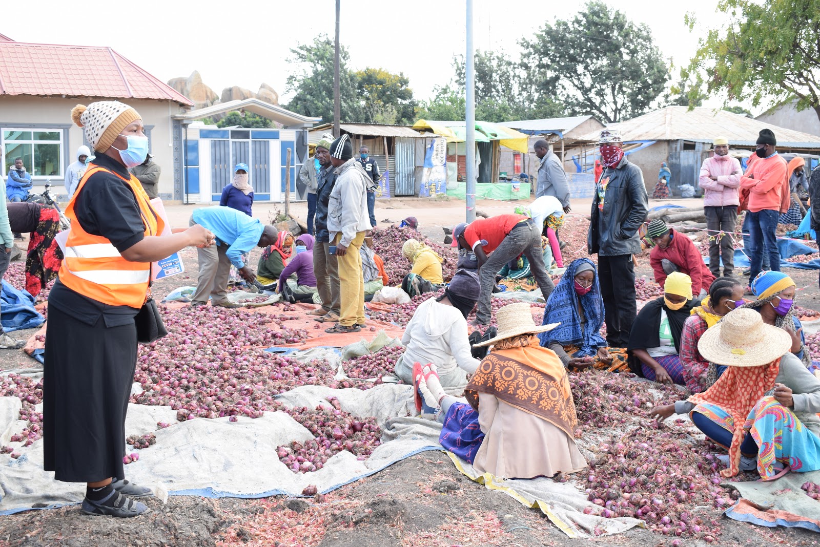Afisa wa Shirika lisilo la Kiserikali la Sustanable Environment Management Action (SEMA) la Mkoa wa Singida, Witness Andersoon (kushoto) akitoa elimu kwa wananchi na wafanyabiashara wa Soko la Vitunguu la Kimataifa la Manispaa ya Singida namna ya kujikinga dhidi ya mlipuko wa ugonjwa wa corona mkoani hapa jana.