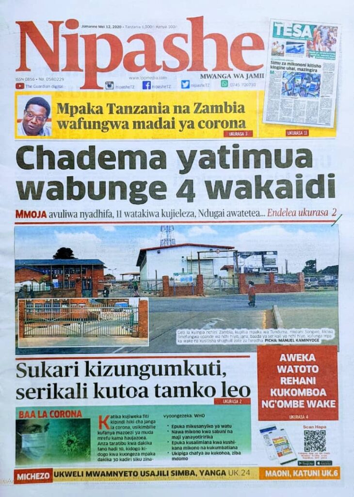 MchanganyikoPITIA VICHWA VYA HABARI KATIKA MAGAZETI YA LEO MAY 12,2020 Last updated: 2020/05/12 at 3:32 AM Alex Sonna 5 years ago Share SHARE Alex Sonna May 12, 2020 May 12, 2020 Share this Article Facebook Twitter Email Print Previous Article SHIDA YA UMEME BASI TENA MTIBWA SUKARI Next Article MKUU WA WILAYA YA MULEBA AREJESHA TABASAMU LA WAKAZI WA KATA ZA KAGOMA NA KIKUKU