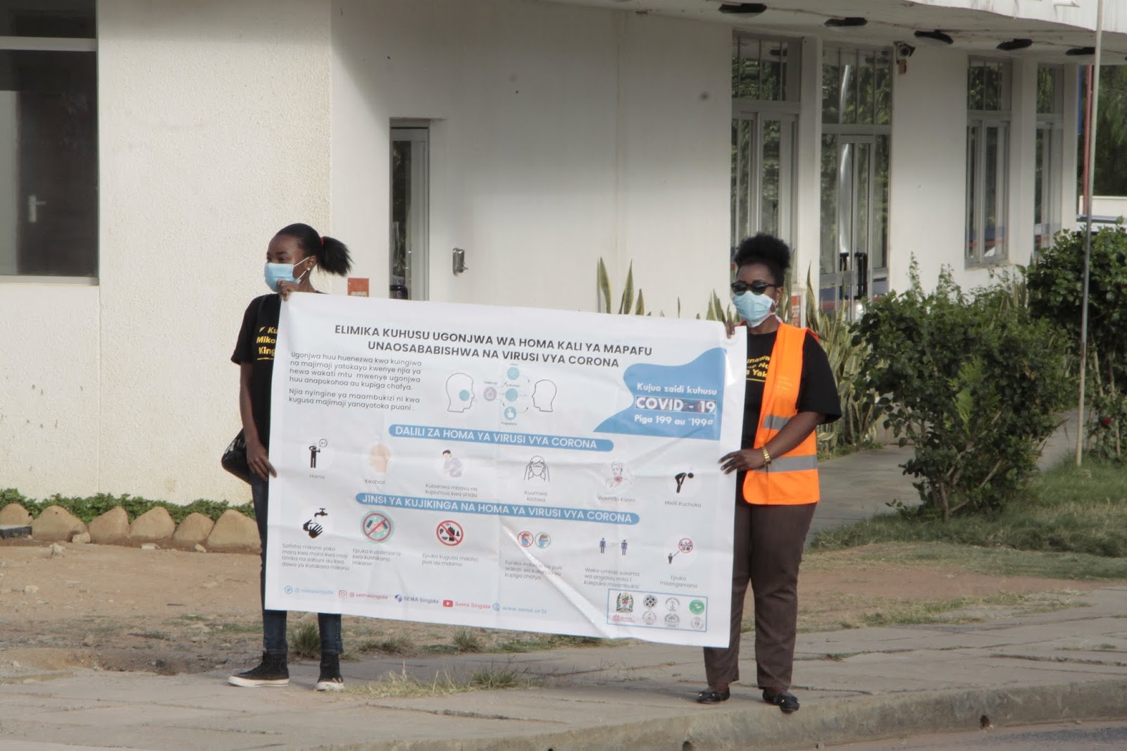 Maafisa wa Shirika lisilo la Kiserikali la Sustanable Environment Management Action (SEMA) la Mkoa wa Singida, Mary Kilimba (kushoto) na Veronica Peter wakitoa elimu kwa wananchi kwa njia ya mabango katika Barabara ya Arusha mjini hapa leo namna ya kujikinga dhidi ya mlipuko wa ugonjwa wa corona.