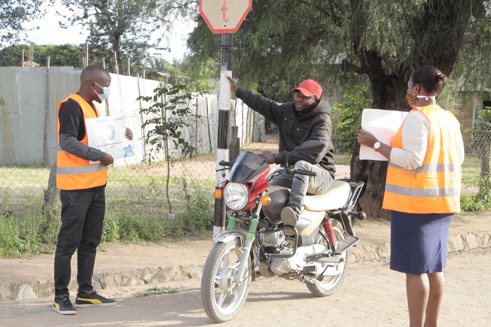 Maafisa wa Shirika la SEMA, wakitoa elimu kwa dereva Bodaboda. Kushoto ni Afisa Mradi wa SEMA, Renard Mwasambili na Daria John.