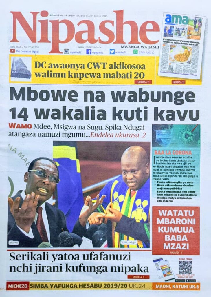 MagazetiPITIA VICHWA VYA HABARI KATIKA MAGAZETI YA LEO MAY 14,2020 Last updated: 2020/05/14 at 3:47 AM Alex Sonna 5 years ago Share SHARE Alex Sonna May 14, 2020 May 14, 2020 Share this Article Facebook Twitter Email Print Previous Article BASHUNGWA AMEWAELEKEZA WAMILIKI WA VIWANDA KUZALISHA VIFAA KINGA VYA KUTOSHA KUKABILIANA NA CORONA. Next Article TARURA SIMIYU KUFUNGUA BARABARA ZILIZOATHIRIWA NA MVUA KUZIFANYA ZIPITIKE WAKATI WOTE