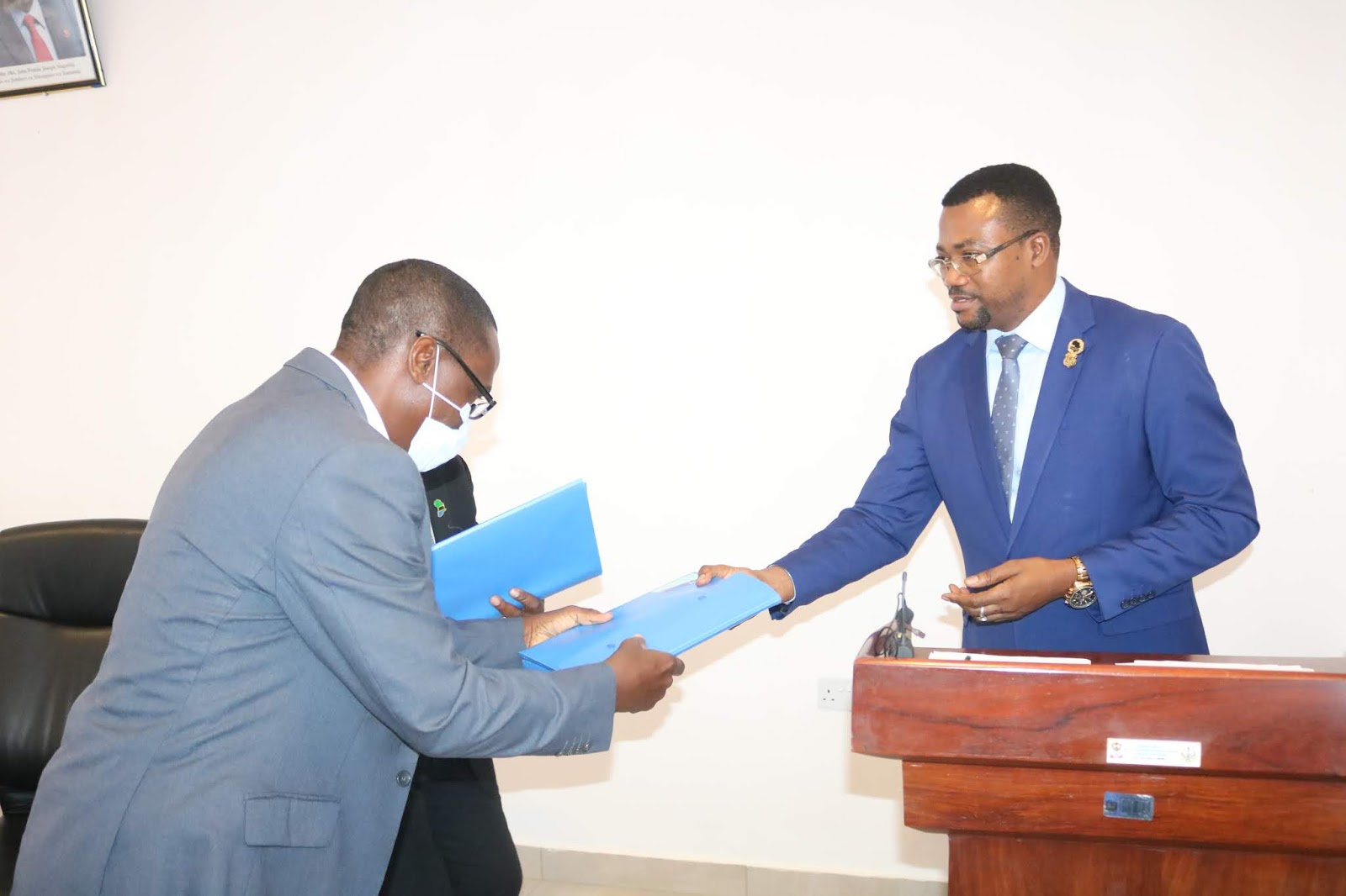 Waziri wa Mifugo na Uvuvi, Luhaga Mpina akimkabidhi vitendea kazi Mtendaji Mkuu wa Wakala wa Maabara ya Veterinari Tanzania (TVLA) baada ya uzinduzi wa Bodi ya TVLA Makao Makuu ya Wizara ya Mifugo na Uvuvi, Mtumba jijini Dodoma.