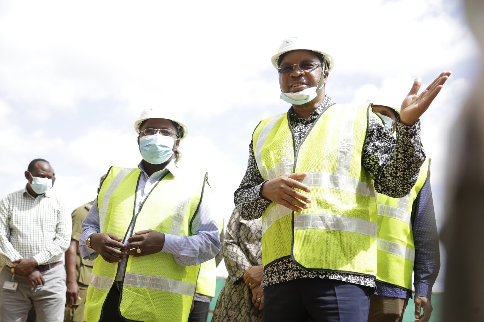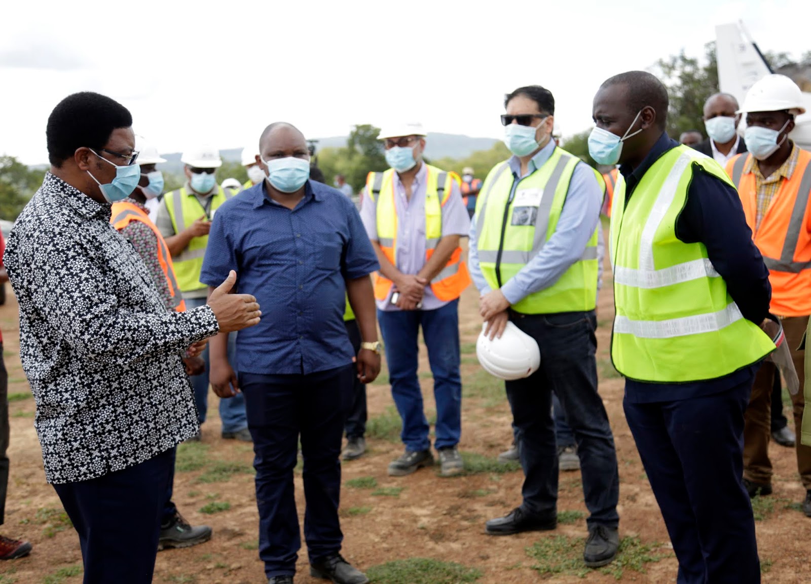 Waziri wa Nishati, Dkt. Medard Kalemani (wakwanza kushoto), akiteta jambo na Mkurugenzi qa TANESCO Dkt. Tito Mwinuka (aliyevaa nguo nyeusi), Katibu Mkuu Wizara ya Nishatio Mhandisi Aziza Said (wapili kushoto) na wakandarasi wa kampuni za Arab Contractors na Elsewedy zote kutoka Misri, wakati wa ziara ya Waziri Mkuu, Kassim Majaliwa kutembelea mradi wa umeme wa maji wa Julius Nyerere (JNHPP) huko Rufiji Mkoani Pwani 14/5/2020.