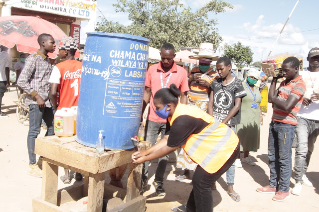 Afisa wa Shirika la Sustanable Environment Management Action (SEMA) la Singida , Witness Anderson akionesha namna ya kunawa kwa usahihi kwa wananchi waliokuwa Stendi ya Mabasi ya Wilaya ya Manyoni mkoani Singida juzi, wakati wa kampeni ya utoaji elimu ya kujikinga na ugonjwa wa Corona iliyofanywa na shirika hilo kwa kushirikiana na Shirika la Empower Youth Prosperity ( EYP) ya mkoani Mbeya kwa ufadhili wa Shirika la Stromme East Africa Foundation lenye Makao Makuu Kampala nchini Uganda kwa kushirikiana na Shirika la Stromme Foundation la Norway pamoja na Shirika la Umoja wa Mataifa la Mpango wa Chakula (WFP) kupitia mradi wa uwezeshaji jamii kiuchumi unaowalenga vijana.wa kiume, wa kike, watoto na wakina mama.