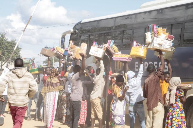 Wafanyabiashara ndogo ndogo katika Stendi ya Mabasi ya Manyoni wakifanya biashara zao bila ya kuchukua tahadhari kusimama umbali wa mita moja kati ya mtu na mtu.