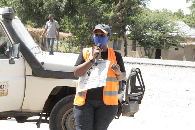 Afisa Mradi kutoka Shirika la SEMA, Nice Daudi, akizungumza na wananchi wa Manyoni kuhusu ugonjwa wa Corona.