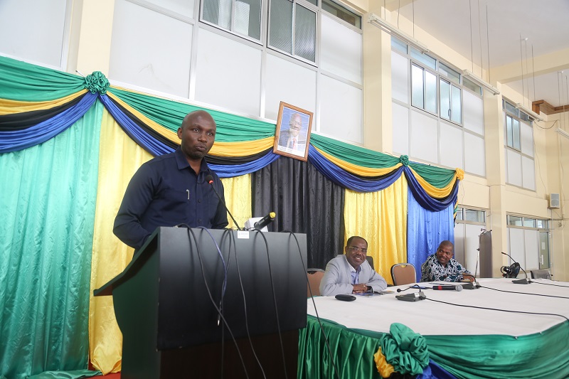 Naibu Waziri Ofisi ya Makamu wa Rais (Muungano na Mazingira) Mhe. Mussa Sima akizungumza na wafanyabiashara wa vyuma chakavu kutoka badhi ya mikoa (hawapo pichani) jijini Tanga. Wengine pichani ni Mkuu wa Mkoa wa Tanga Mhe. Martine Shigela na Mkuu wa Wilaya ya Tanga Mhe. Thobias Mwilapwa.