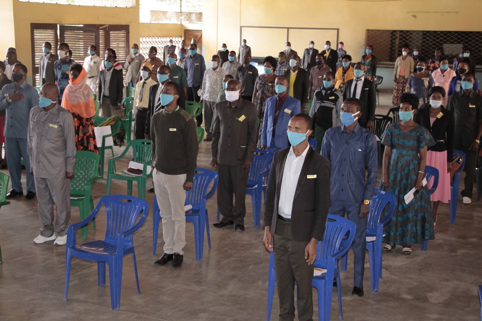 Wajumbe wa mkutano huo wakiimba wimbo wa Taifa kabla ya kuanza kwa mkutano huo wa uchaguzi ngazi ya mkoa.