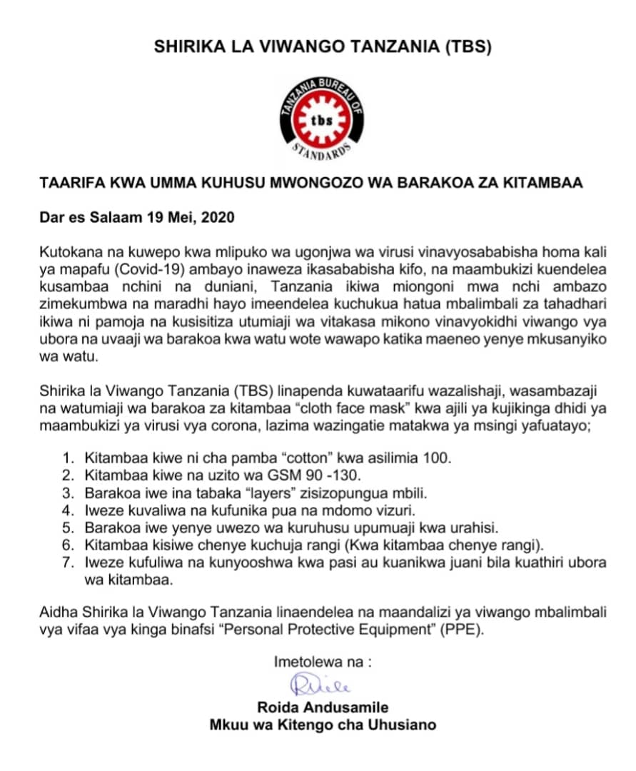 MchanganyikoTBS YATOA MWONGOZO KWA WANAOTENGENEZA BARAKOA ZA VITAMBAA Last updated: 2020/05/19 at 3:51 PM joseph 5 years ago Share SHARE joseph May 19, 2020 May 19, 2020 Share this Article Facebook Twitter Email Print Previous Article ZAO LA MPUNGA KAHAMA HATARINI KUOZEA MASHAMBANI Next Article Aliyekuwa Kiongozi wa juu CHADEMA na NCCR Mageuzi Atimkia CCM .