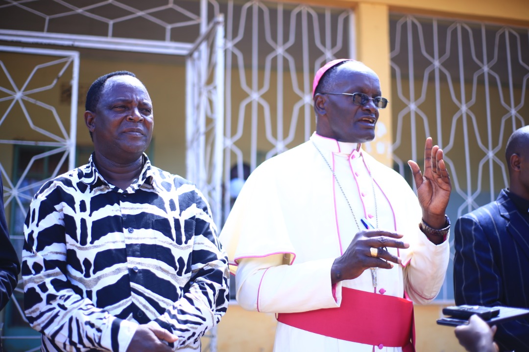 Asikofu Almachius Rweyongeza mwenye kanzu nyeupe pamoja na viongozi wengine wa dini wakiongea na viongozi wenzao wa dini.