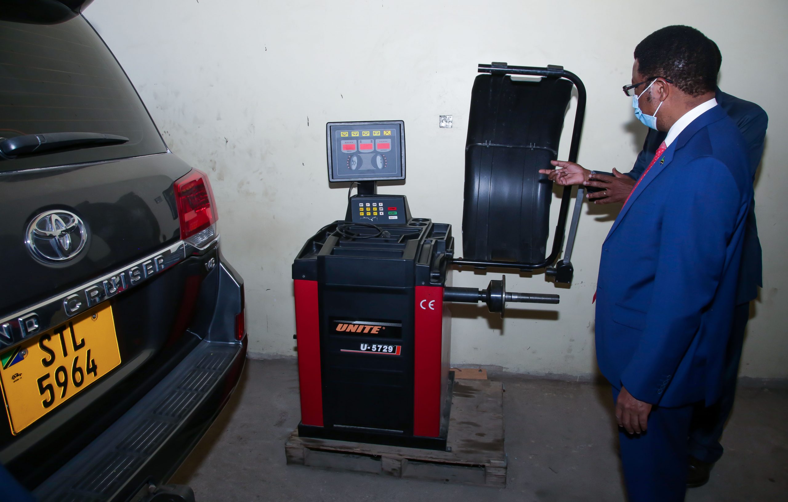 Waziri Mkuu, Kassim Majaliwa, akiangalia mashine ya kupimia matairi, wakati alipotembelea karakana ya mitambo ya wakala wa Ufundi na Umeme (TEMESA), jijini Dodoma, May 19, 2020, ( Picha na Ofisi ya Waziri Mkuu)