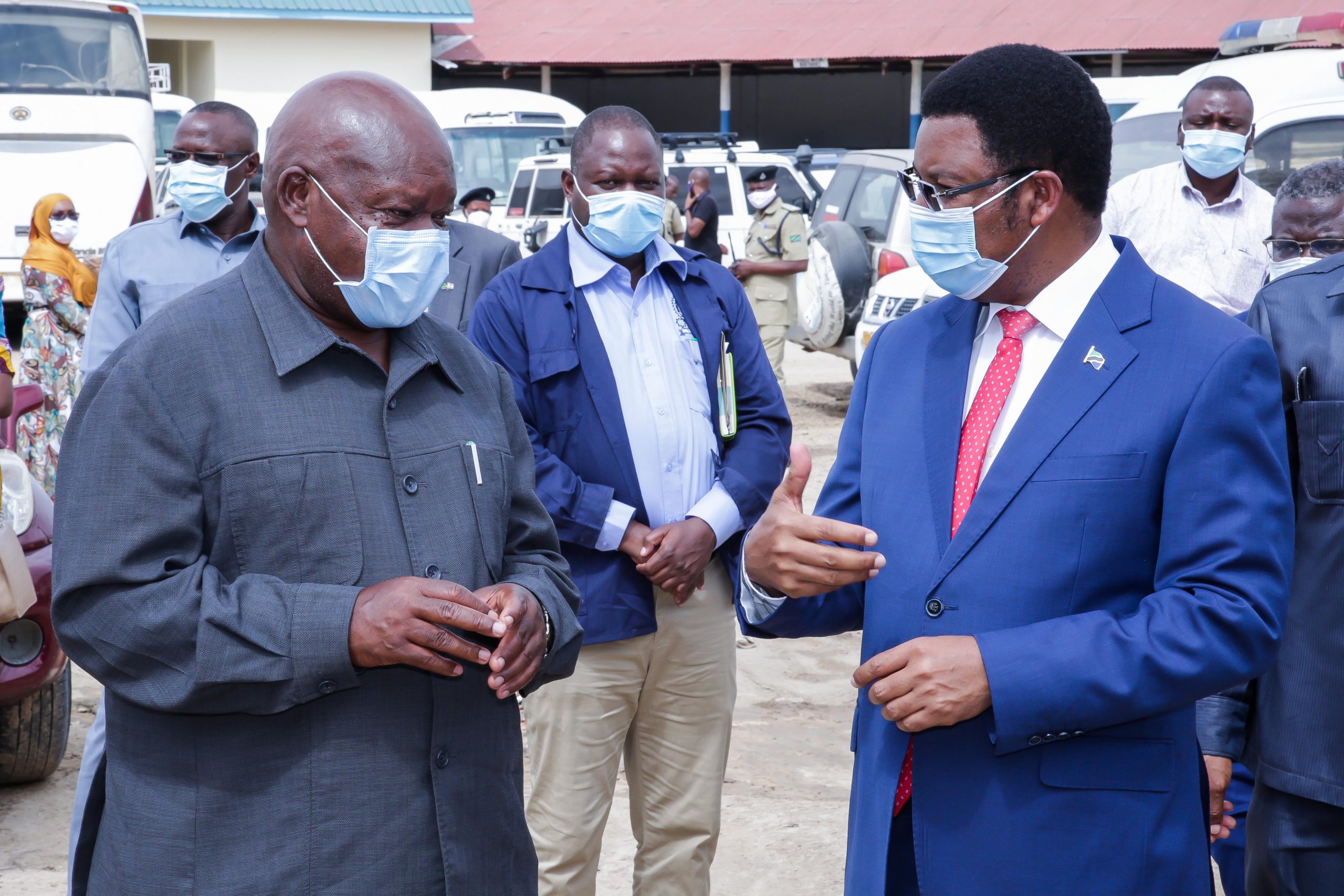 Waziri Mkuu, Kassim Majaliwa, akizungumza na Waziri wa Ujenzi, Uchukuzi na Mawasiliano, Mhandisi Isack Kamwelwe, baada ya kukagua karakana ya mitambo ya wakala wa Ufundi na Umeme (TEMESA), jijini Dodoma, May 19, 2020, ( Picha na Ofisi ya Waziri Mkuu).