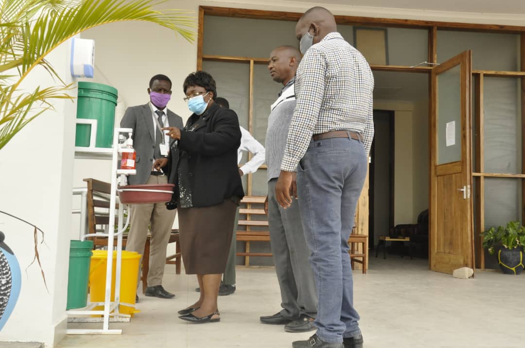 Mkurugenzi Msaidizi Rasilimaliwatu, Hilda Tegwa (Wa tatu kulia) akitakasa mikono yake kwa ajili ya kuchukua tahadhari dhidi ya ugonjwa wa Covid-19, wengine ni baadhi ya Watumishi wa Wizara hiyo wakisubiri kutakasa mikono yao kabla ya kuingia katika Ofisi za Wizara hiyo, Jijini Dodoma leo.