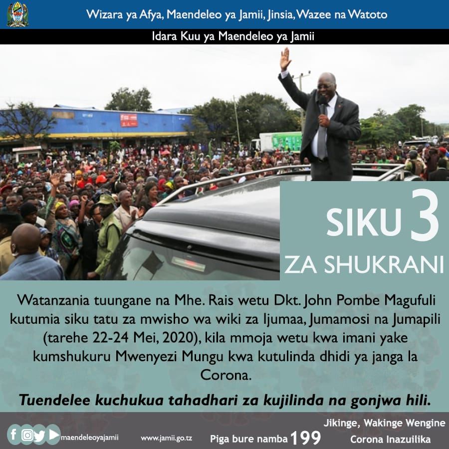 Rais Magufuli aliwahimiza Wananchi katika kipindi hiki cha Siku tatu za kumshukuru Mwenyezi Mungu kuendelea kufuata maelekezo ya Wataalam wa afya na kuchukua tahadhari dhidi ya maambukizi ikiwemo kunawa mikono mara kwa mara kwa sabuni na maji tiririka, kuepuka misongamano isiyo ya lazima na kuvaa Barakoa.