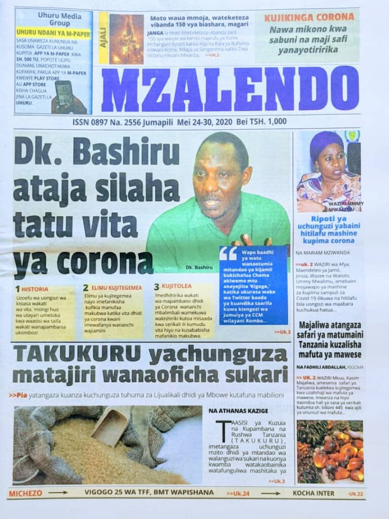 MagazetiPITIA VICHWA VYA HABARI KATIKA MAGAZETI YA LEO MAY 24,2020 Last updated: 2020/05/24 at 3:45 AM Alex Sonna 5 years ago Share SHARE Alex Sonna May 24, 2020 May 24, 2020 Share this Article Facebook Twitter Email Print Previous Article MHARIRI MKUU WA FULLSHANGWE MEDIA ASHEHEREKEA SIKU YAKE YA KUZALIWA SIKU YA EID AL FITR Next Article WANANCHI WAPONGEZA UHAMASISHAJI HUDUMA ZA CHANJO MUHEZA