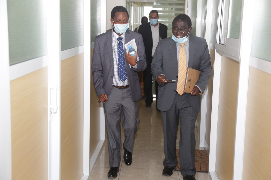 (Kulia) akimsindikiza Mwenyekiti wa THBUB, Jaji (Mst) Mathew Mwaimu (kushoto) mara