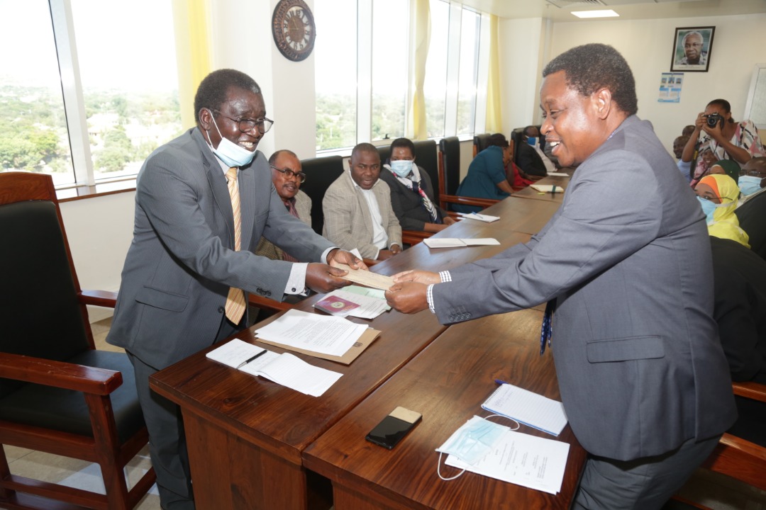 Sekretarieti ya Maadili ya Utumishi wa Umma, Jaji (Mst) Harold Nsekela (Kushoto) barua ili