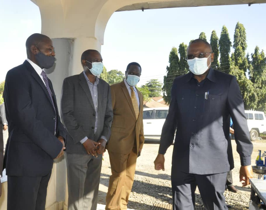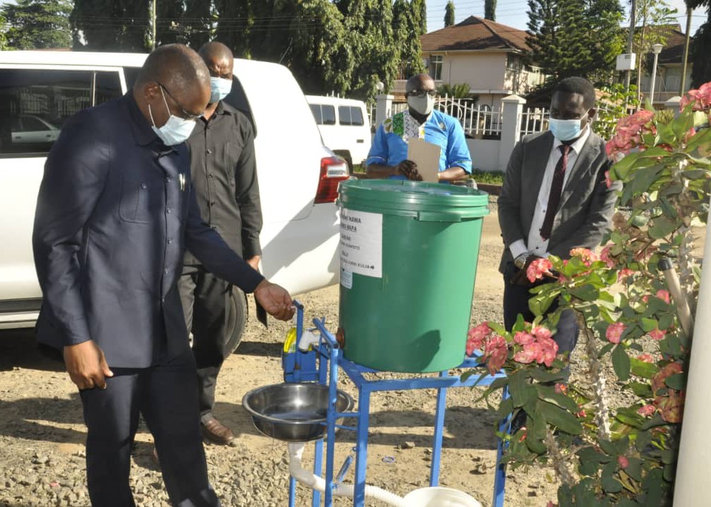 Katibu Mkuu wa Wizara ya Mambo ya Ndani ya Nchi, Christopher Kadio (Wa kwanza kushoto) akitakasa mikono baada ya kuwasili katika Ukumbi wa Bwalo la JKT Umwema, ulipofanyika Mkutano wa Mwaka wa Tathmini ya Utendaji Kazi wa Idara ya Huduma za Uangalizi, Mjini Morogoro leo.