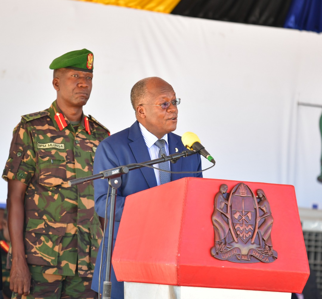 Rais wa Jamhuri ya Muungano wa Tanzania Mheshimiwa Dkt. John Pombe Magufuli akiangalia bendi ya ya JKT mara baada ya hafla ya uwekaji wa jiwe la msingi Ujenzi Ofisi za Ikulu ya Chamwino Mkoani Dodoma leo tarehe 30 Mei 2020.
