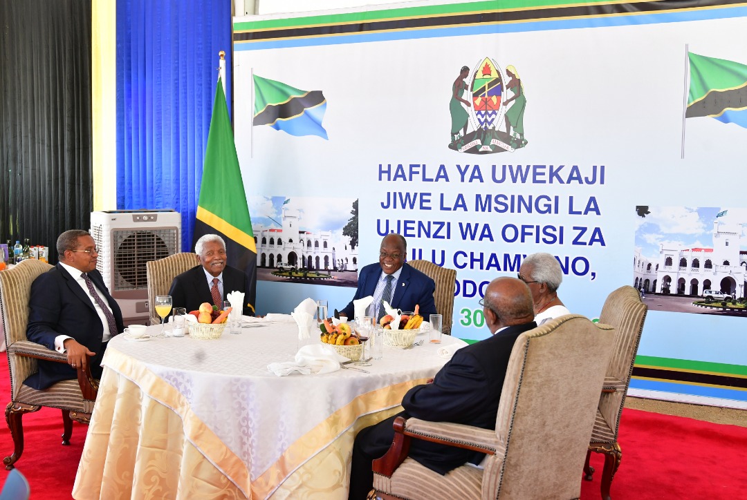 Rais wa Jamhuri ya Muungano wa Tanzania Mheshimiwa Dkt. John Pombe Magufuli pamoja Rais Mstaafu wa Awamu ya Pili Mzee Ali Hassan Mwinyi, Rais Mstaafu wa Awamu ya Tatu Benjamin Mkapa, Rais Mstaafu wa Awamu ya nne Dkt. Jakaya Kikwete pamoja na Mjane wa Baba wa Taifa Mama Maria Nyerere wakisikiliza maelezo kuhusu ujenzi wa Ikulu ya Chamwino mkoani Dodoma.
