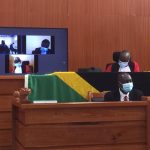 Rais wa Jamhuri ya Muungano wa Tanzania Mheshimiwa Dkt. John Pombe Magufuli akiwa ameshika Chepe ili kuweka zege na Rais Mstaafu wa Awamu ya nne Dkt. Jakaya Kikwete pamoja na Rais Mstaafu wa Awamu ya Tatu Benjamin Mkapa kuashiria uwekaji wa jiwe