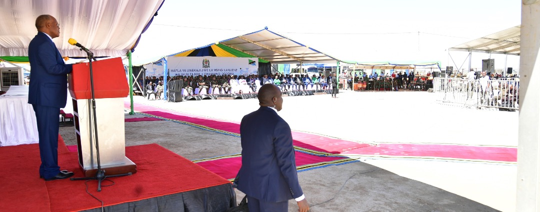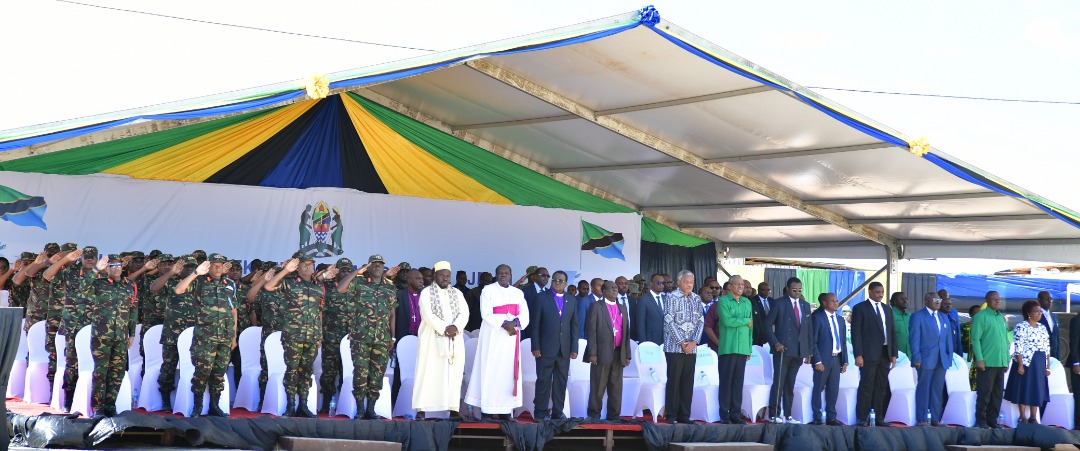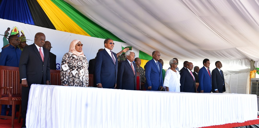 Viongozi mbalimbali wakiwa wamesimama wakati wimbo wa Taifa ukipigwa katika hafla ya uwekaji wa Jiwe la Msingi Ujenzi wa Ofisi za Ikulu ya Chamwino.