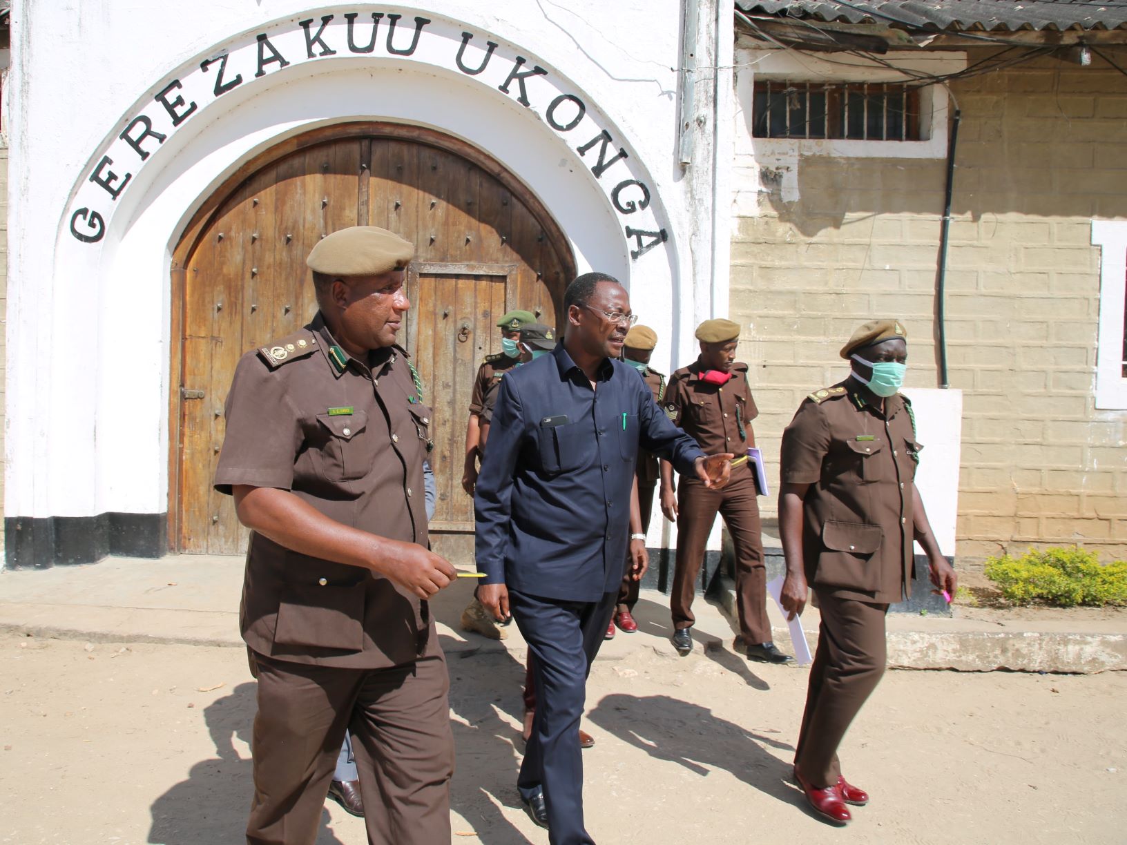 Waziri wa Mambo ya Ndani ya Nchi, George Simbachawene (katikati), akitoka Gereza Kuu Ukonga, baada ya kumaliza ziara yake ya kutembelea Magereza ya Mkoa wa Dar es Salaam, leo. Akizungumza na Maafisa na Askari wa Gereza la Segerea, Ukonga na Keko, Simbachawene alisema Serikali ipo katika mchakato wa kuhakikisha mahabusu nao wanafanya kazi kama ilivyokuwa kwa wafungwa ili kuwezesha Jeshi la Magereza kujitegemea kwa chakula. Kushoto ni Kaimu Mkuu wa Magereza Mkoa wa Dar es salaam, ACP. Solomon Urio, na kulia ni Mkuu wa Gereza Ukonga, ACP. Nsajigwa Mwankenja.